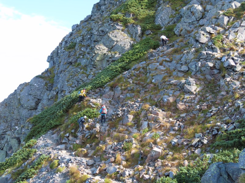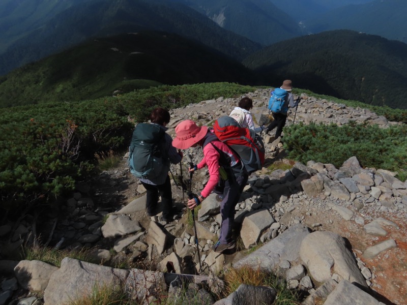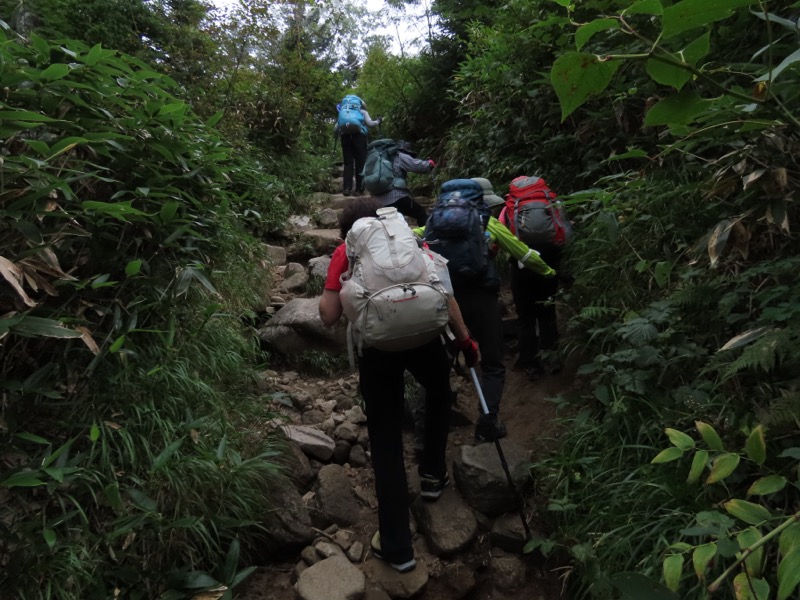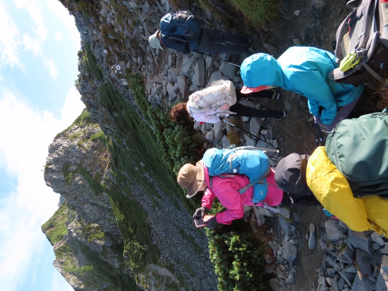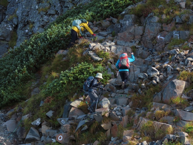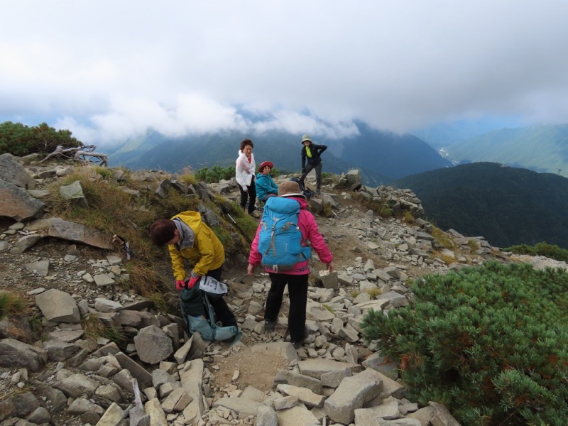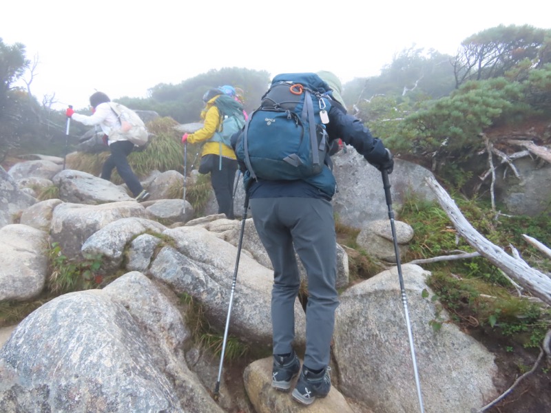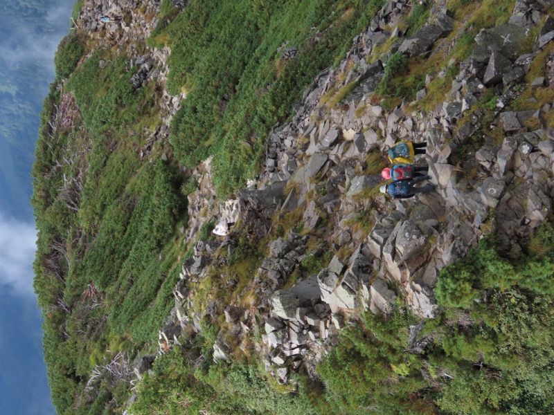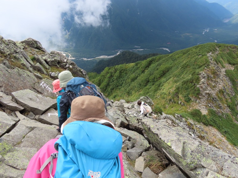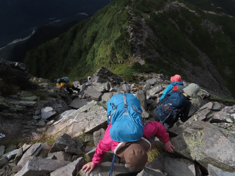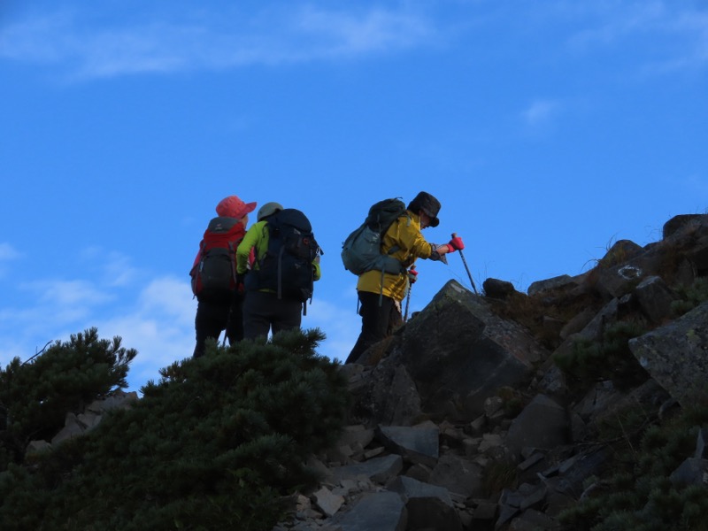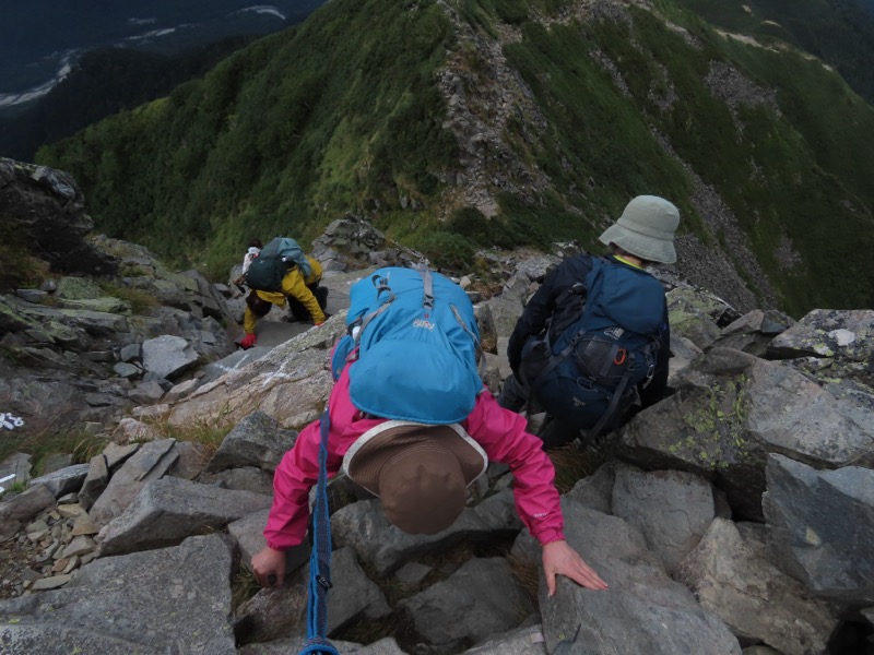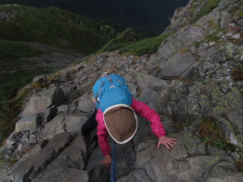 小屋泊まりは2回目というUさんには独標からのくだりに、補助ロープをつけさせてもらいました。落下防止のためではなく、猿回しのヒモ。要するにこまかな動作まで共有するための神経連結。私も神経質になりました。
