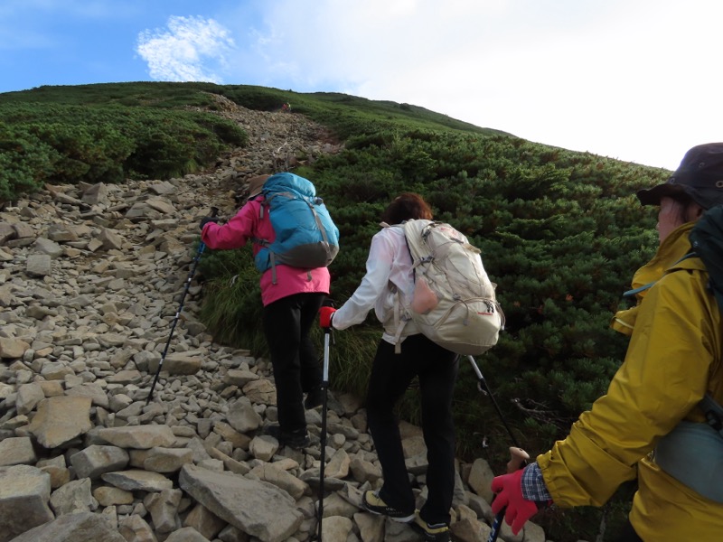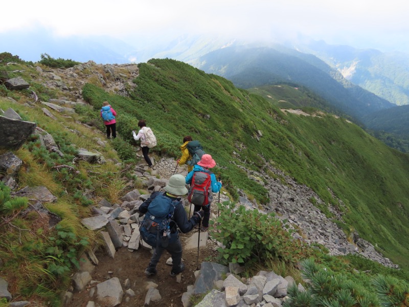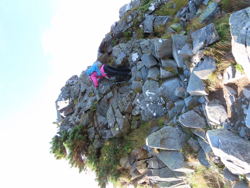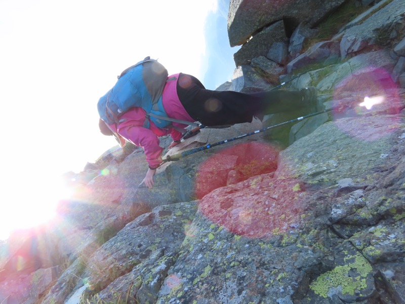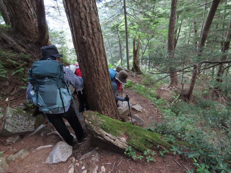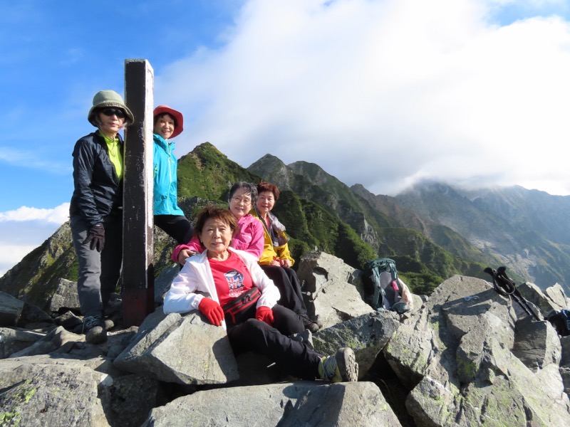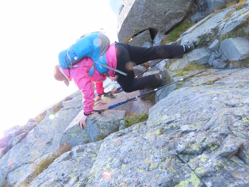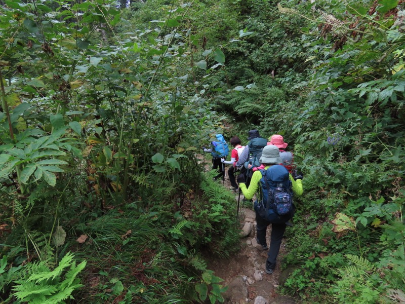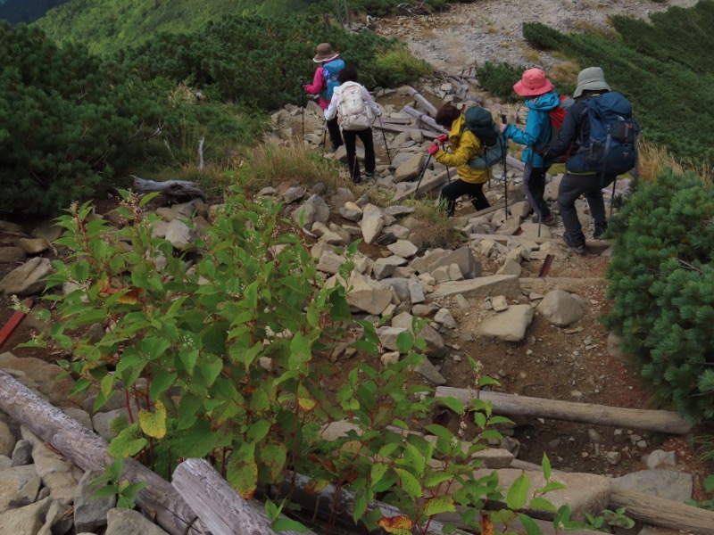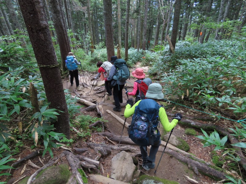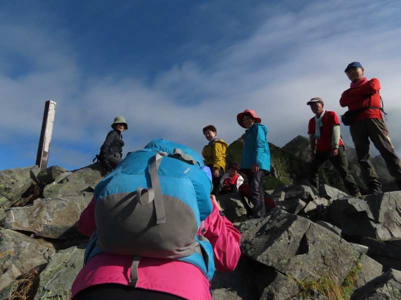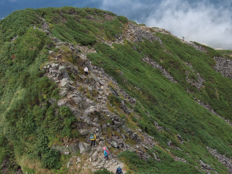 小屋泊まりは2回目というUさんには独標からのくだりに、補助ロープをつけさせてもらいました。落下防止のためではなく、猿回しのヒモ。要するにこまかな動作まで共有するための神経連結。私も神経質になりました。