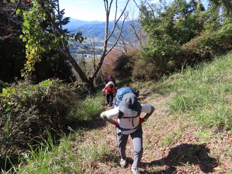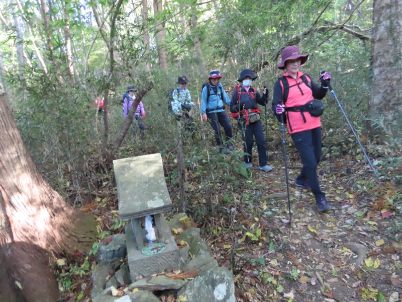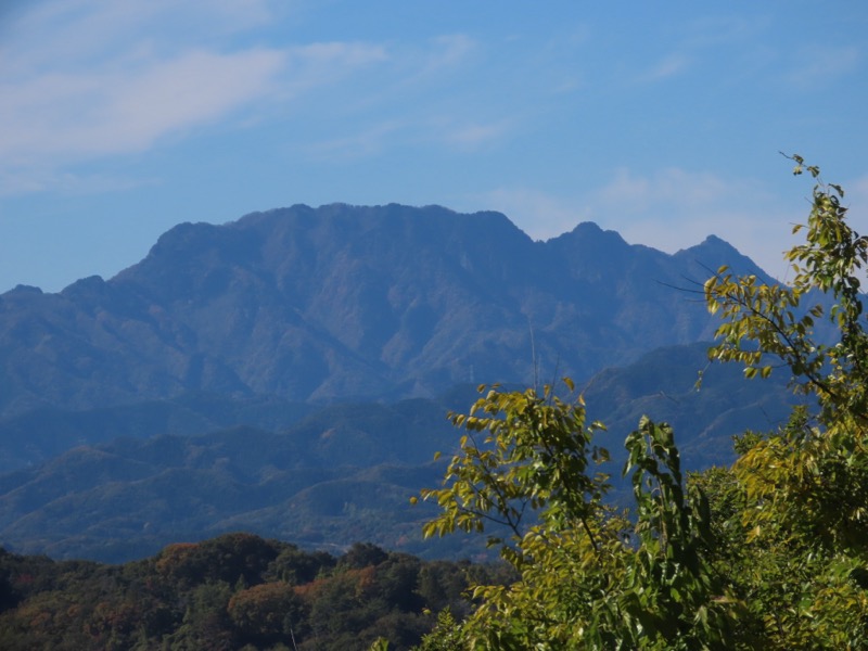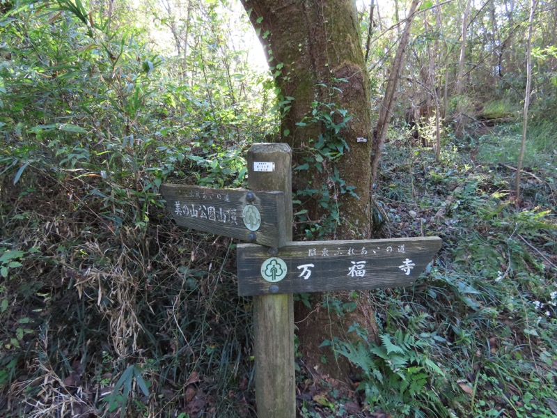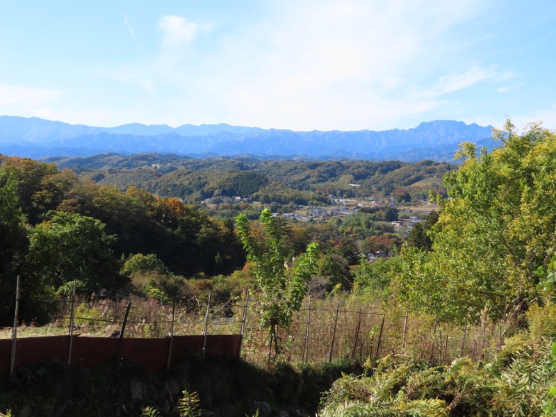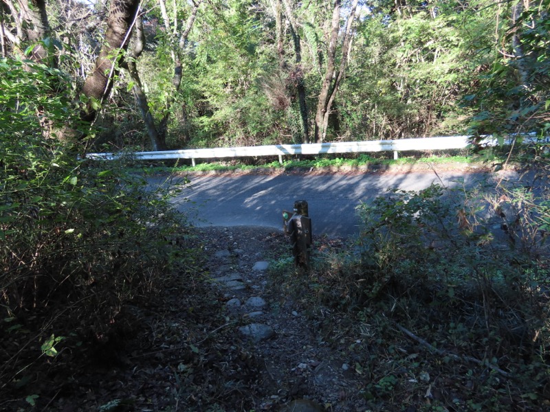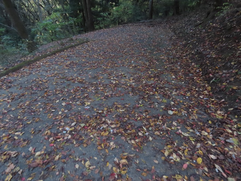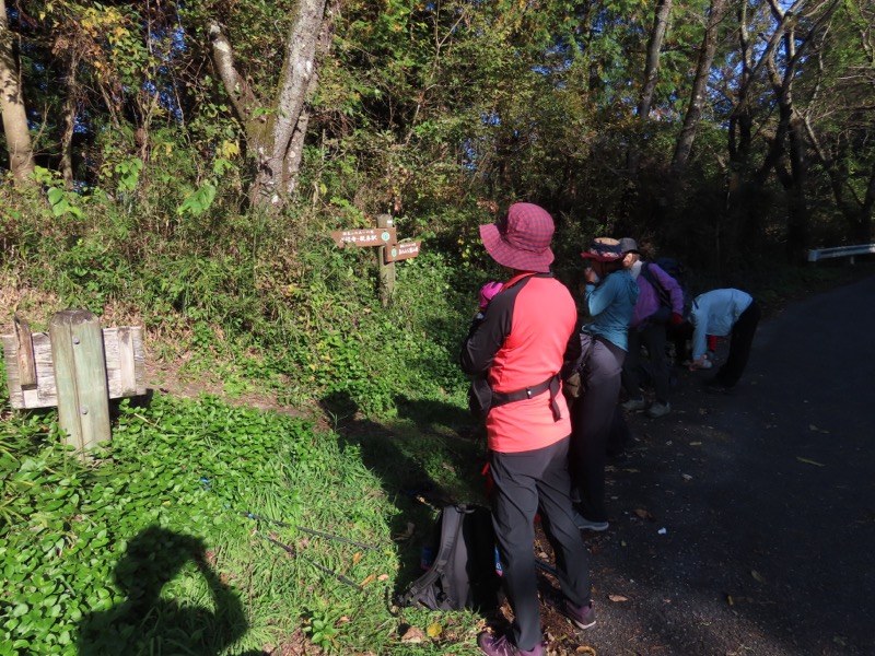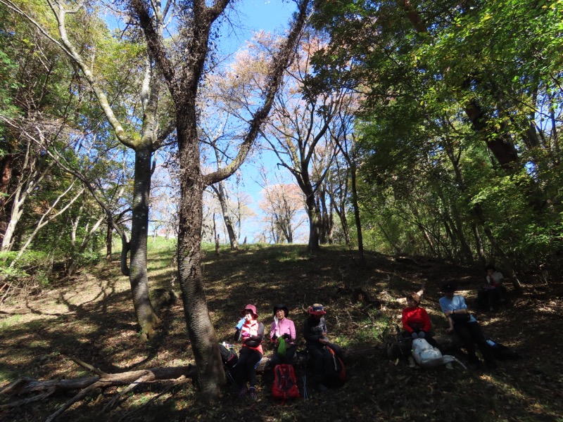 ────1245-1325ごろ_蓑山(美の山)山頂でゆったり休憩(標高=581m) 1355ごろ_関東ふれあいの道の舗装路が登山道に変わる(標高約500m) ────1420ごろ_自動車道を横断。小休憩(標高約280m)