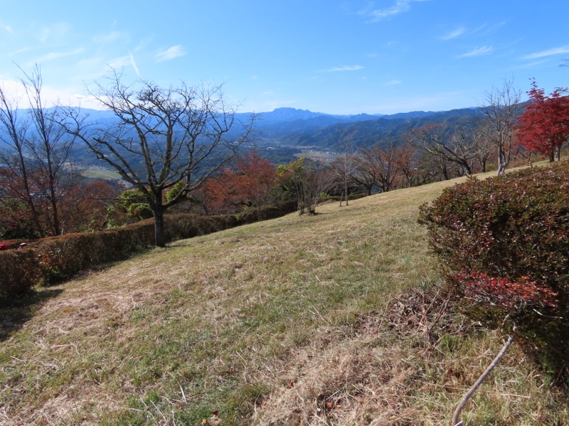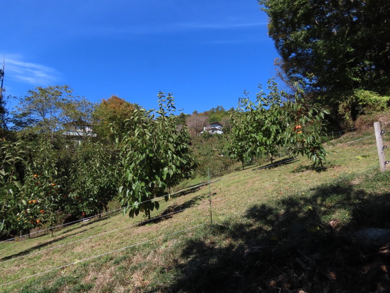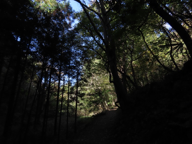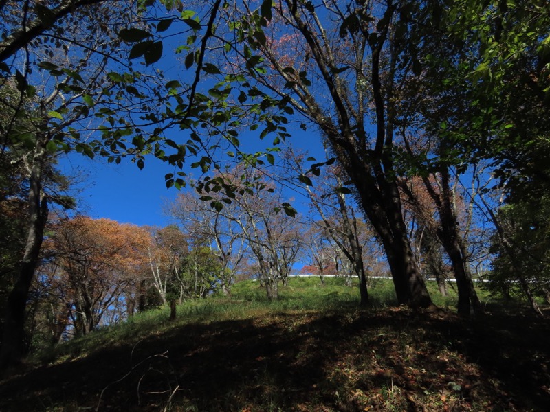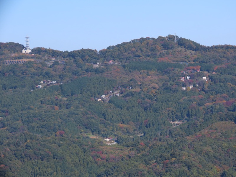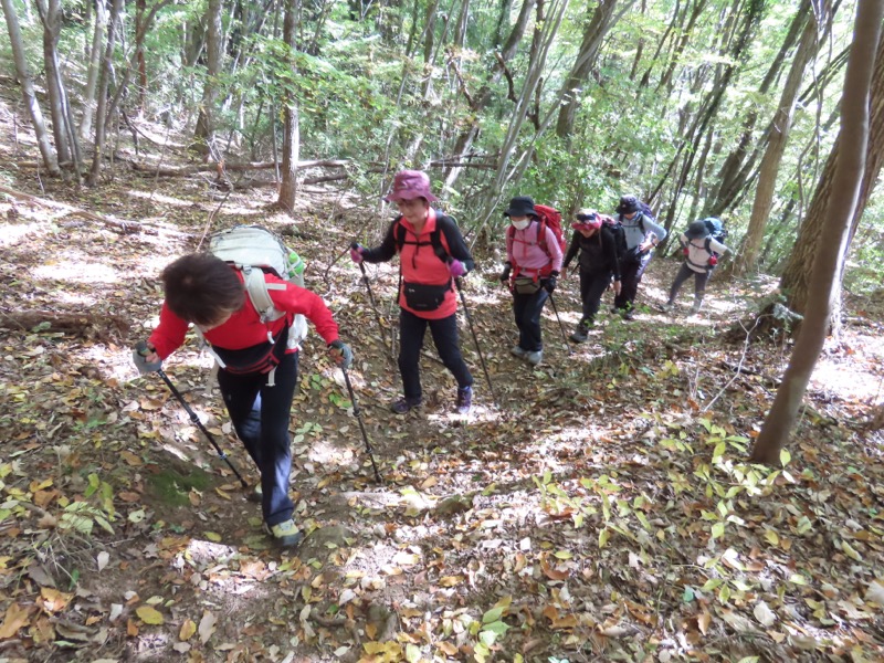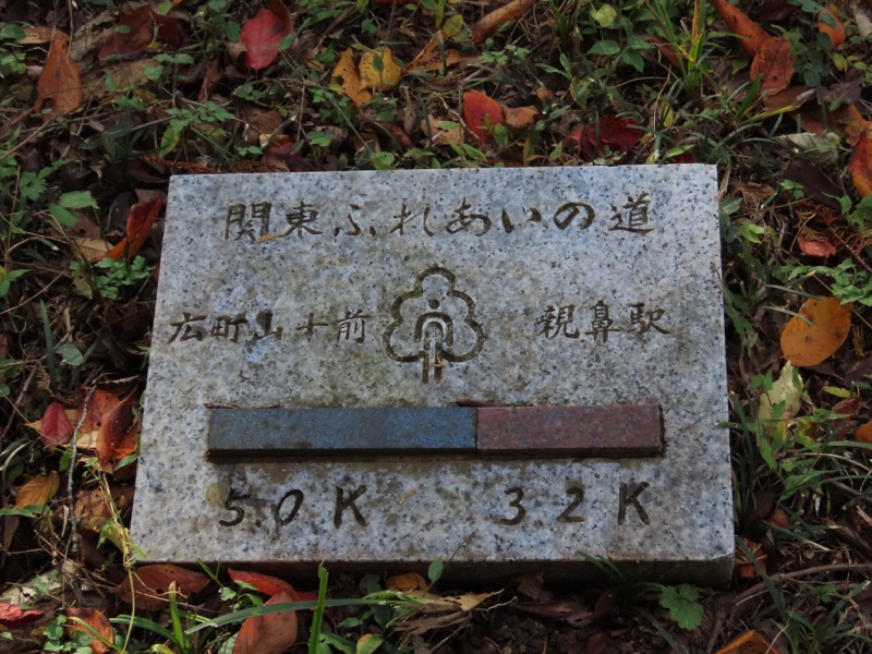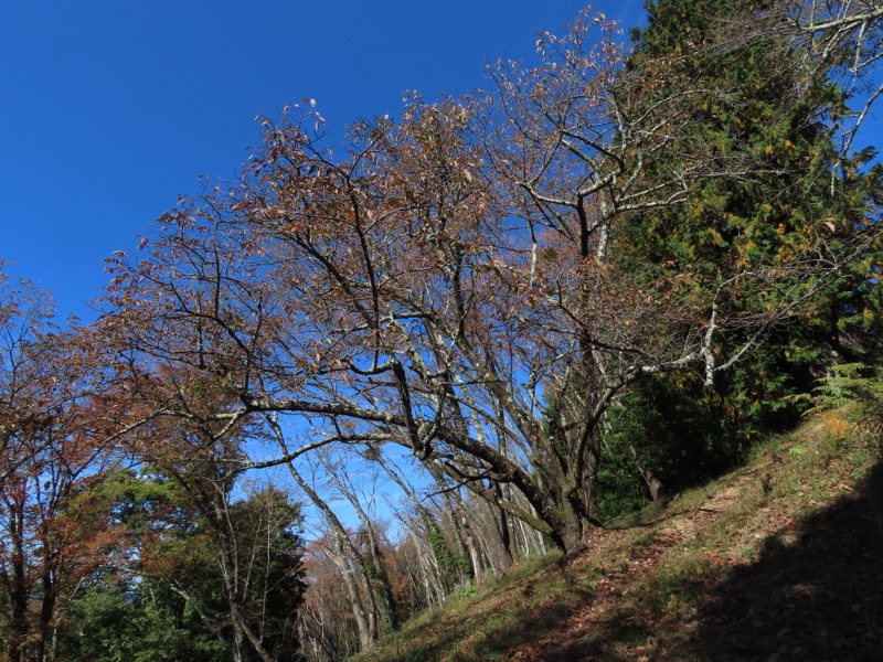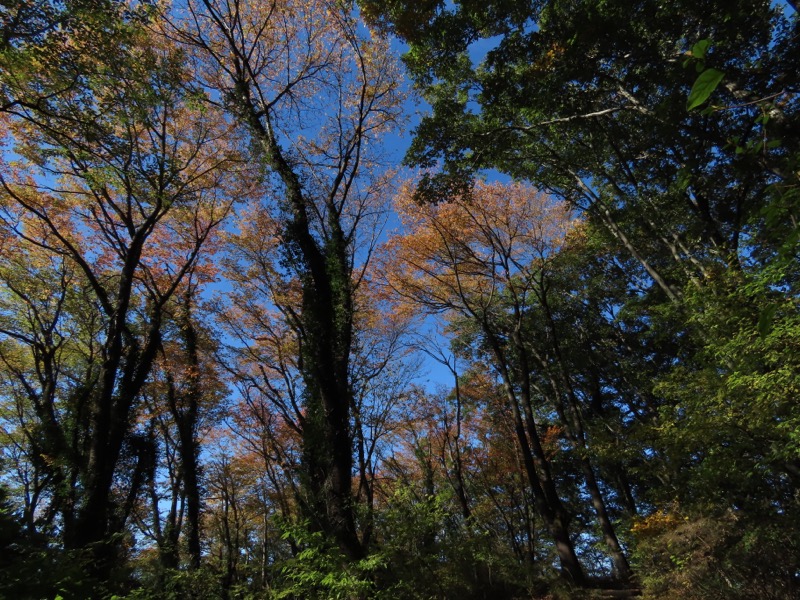 ────1245-1325ごろ_蓑山(美の山)山頂でゆったり休憩(標高=581m) 1355ごろ_関東ふれあいの道の舗装路が登山道に変わる(標高約500m) ────1420ごろ_自動車道を横断。小休憩(標高約280m)