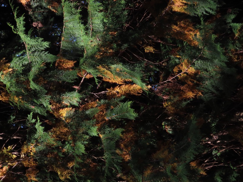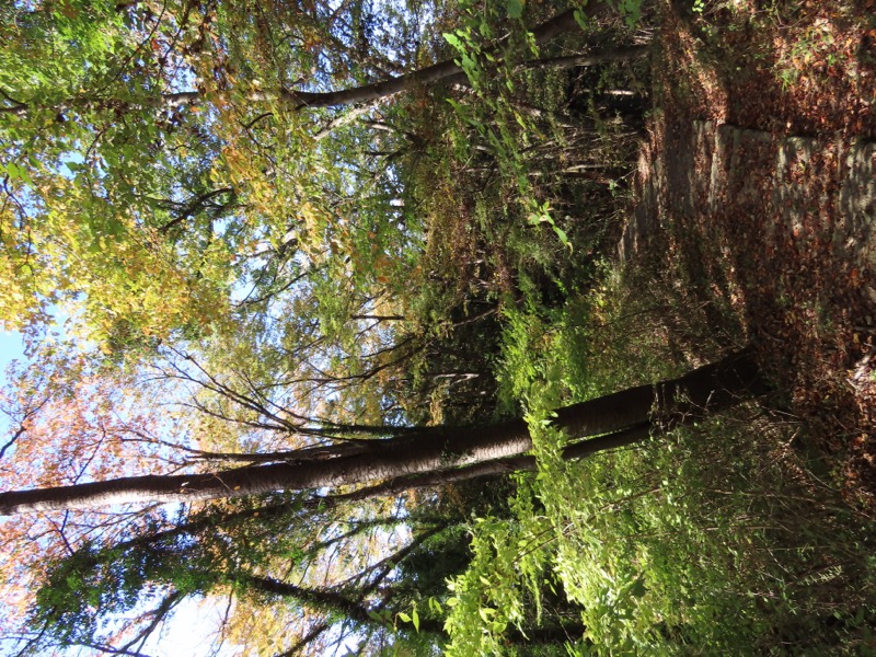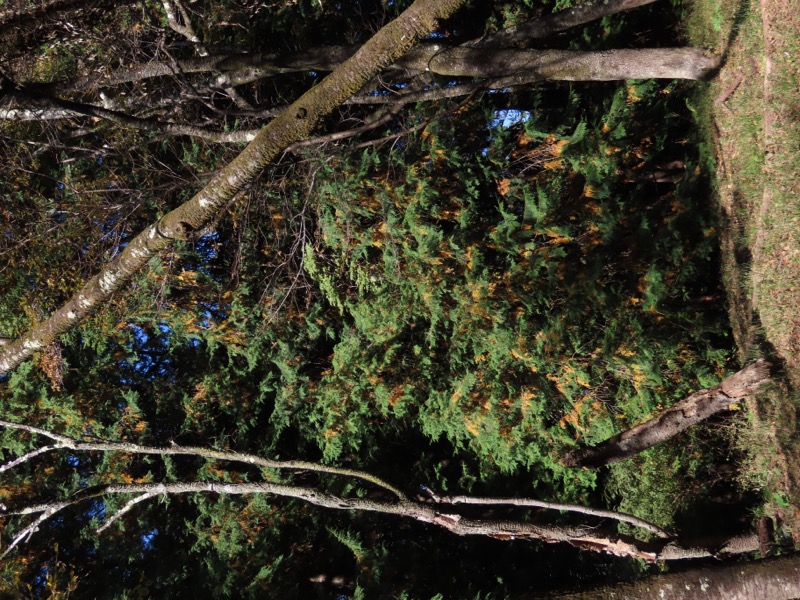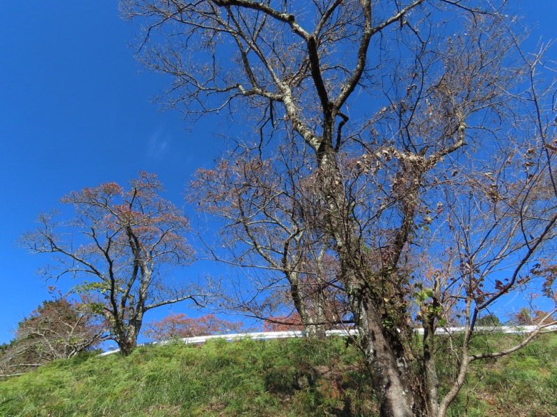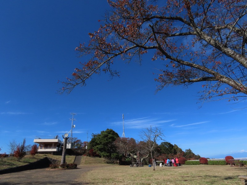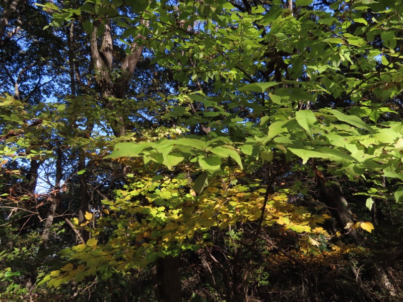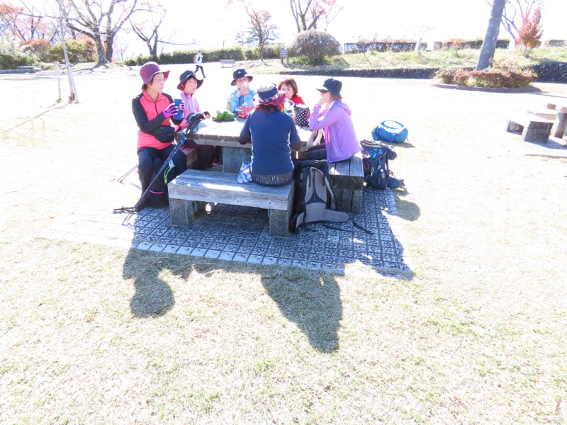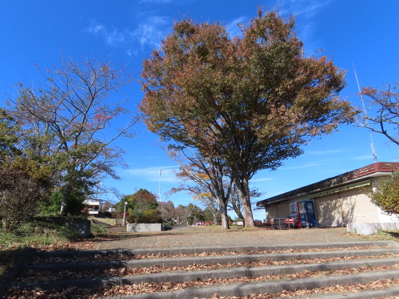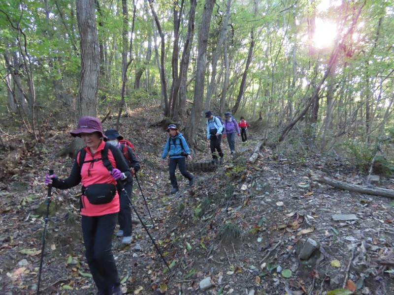 ────1245-1325ごろ_蓑山(美の山)山頂でゆったり休憩(標高=581m) 1355ごろ_関東ふれあいの道の舗装路が登山道に変わる(標高約500m) ────1420ごろ_自動車道を横断。小休憩(標高約280m)