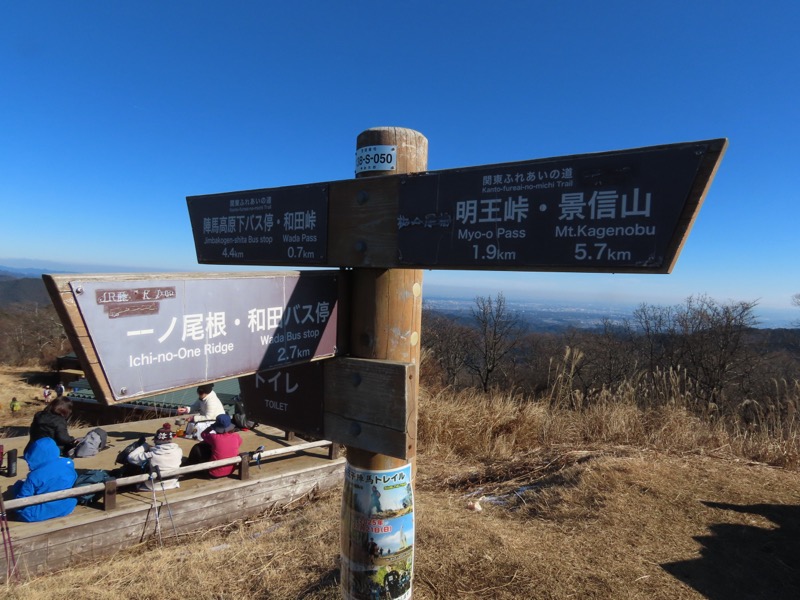 ────0950ごろ_和田峠を出発(標高約690m) 1020-40ごろ_陣馬山(標高=855m) ────1135-1200ごろ_明王峠でトイレ休憩(標高約730m)