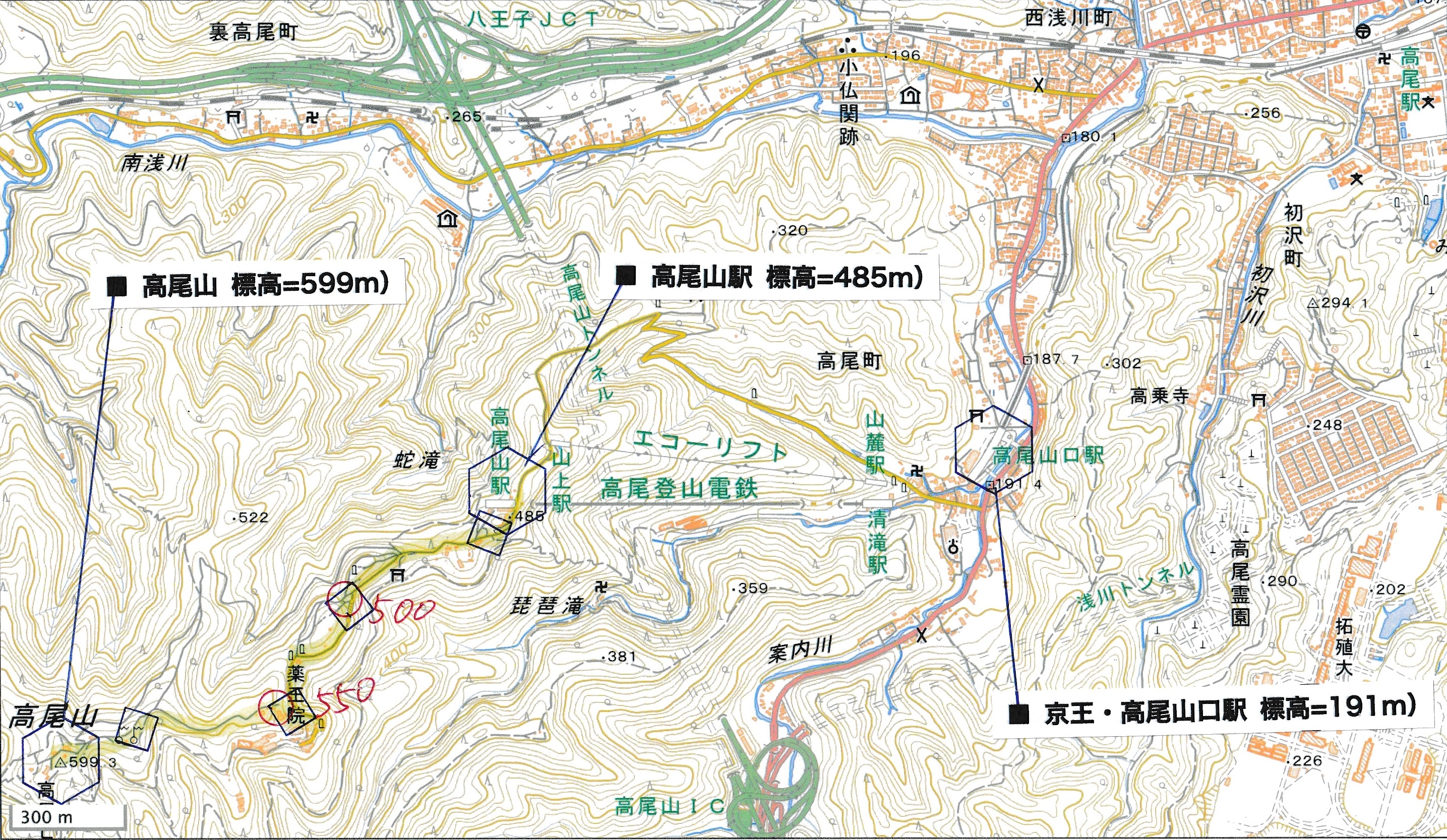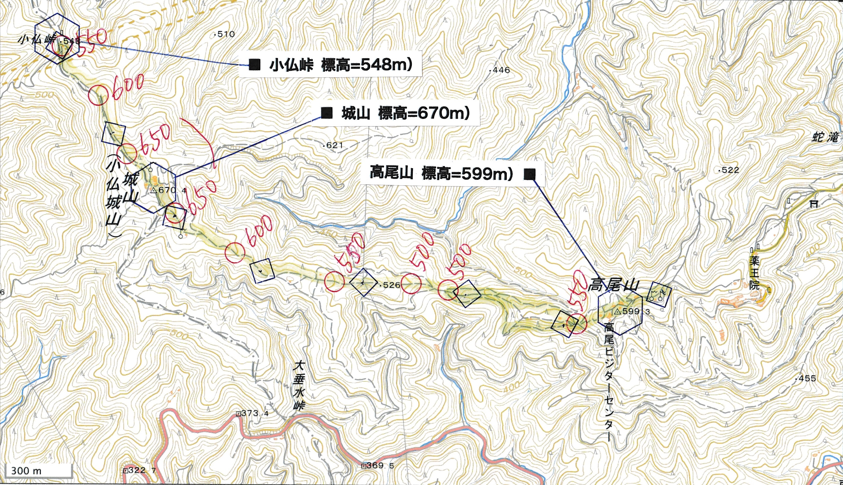────1450-1500ごろ_城山(標高=670m) ────1600-10ごろ_高尾山(標高約599m)